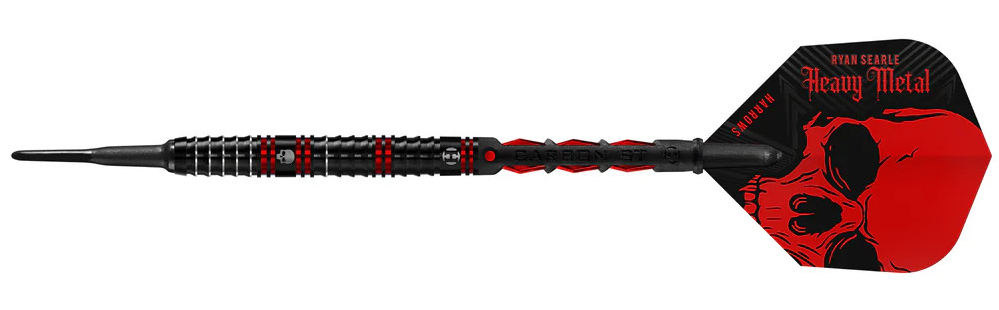 Les fléchettes 90% tungstène du champion PDC anglais Ryan "Heavy Metal" Searle avec un fût conique qui combine des grips alternés en forme de dent de requin et des anneaux classiques. Utilisant les nouvelles technologie d'usinage japonaises CNC, le fût dispose d'une finition nitride de titanium noir complété par des cerclages rouges pour donner un look menaçant.