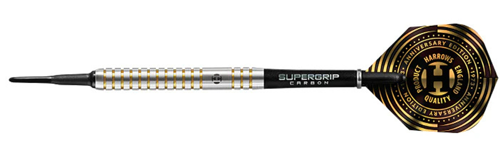 Corps: tungstène 90% avec anneaux de grip dorés et gravure Harrows.