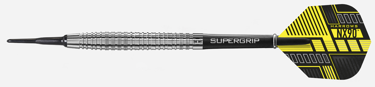 Jeu de fléchettes à pointe plastique haut de gamme de marque Harrows. 90% de tungstène et trois grips différents (cerclages, micro grip et dents de scie). Bombé à l'avant et conique à l'arrière du fût.